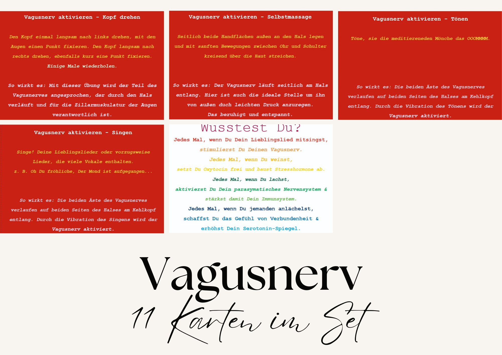 Alle Karten zum Thema "Vagusnerv" gesammelt im Set. Insgesamt 11 Stück mit hilfreichen Tipps und wertvollen Informationen, um den Vagusnerv zu aktivieren.